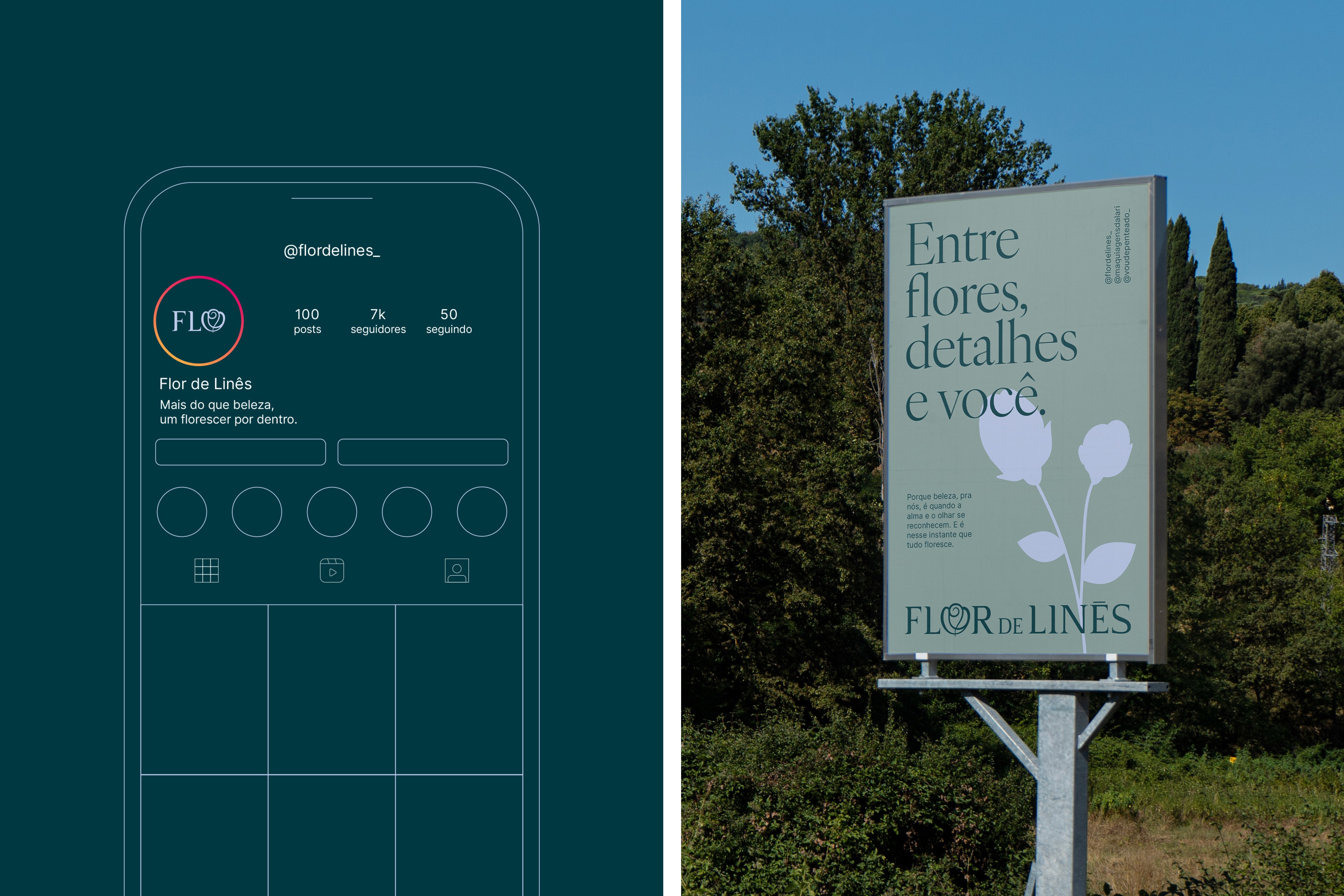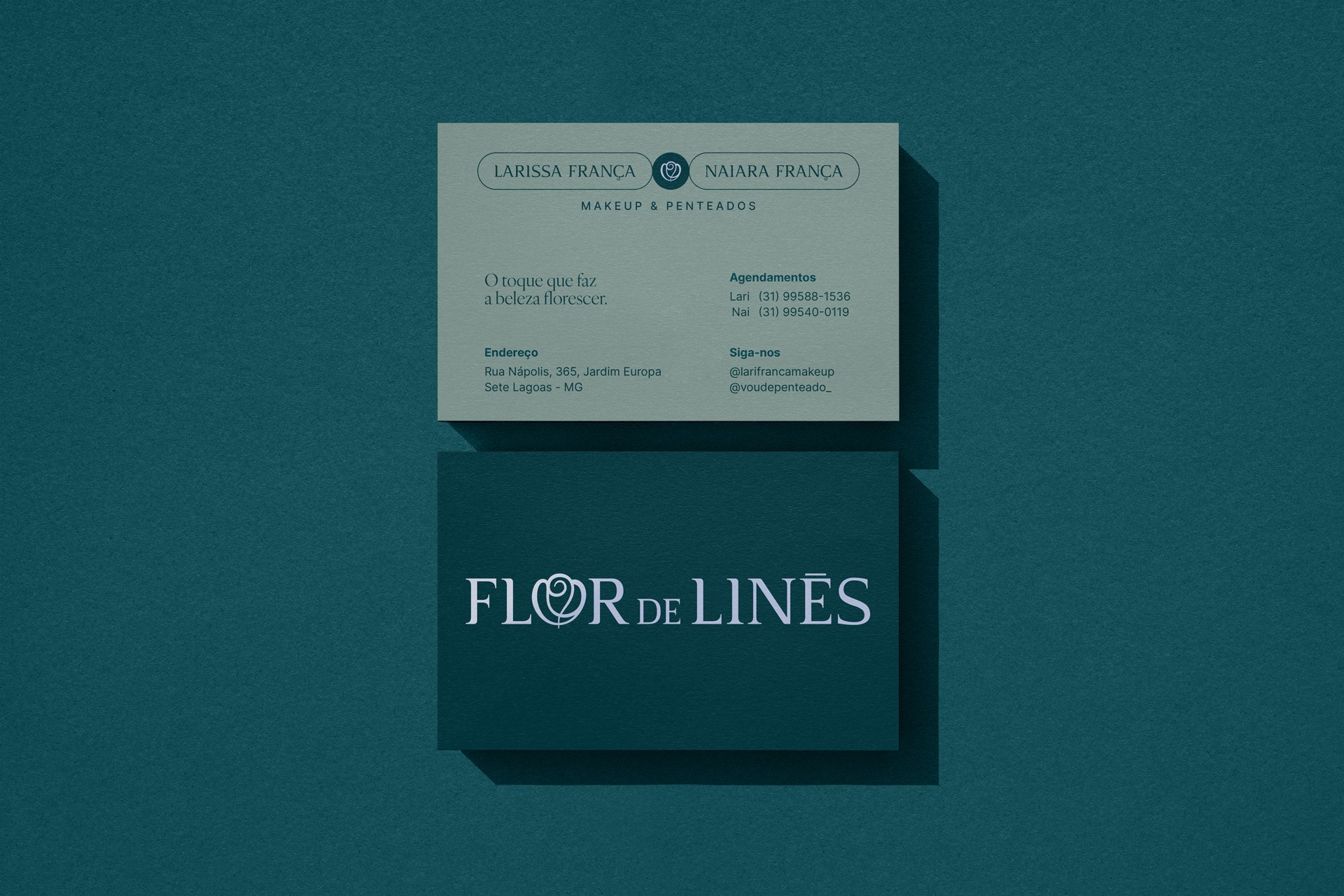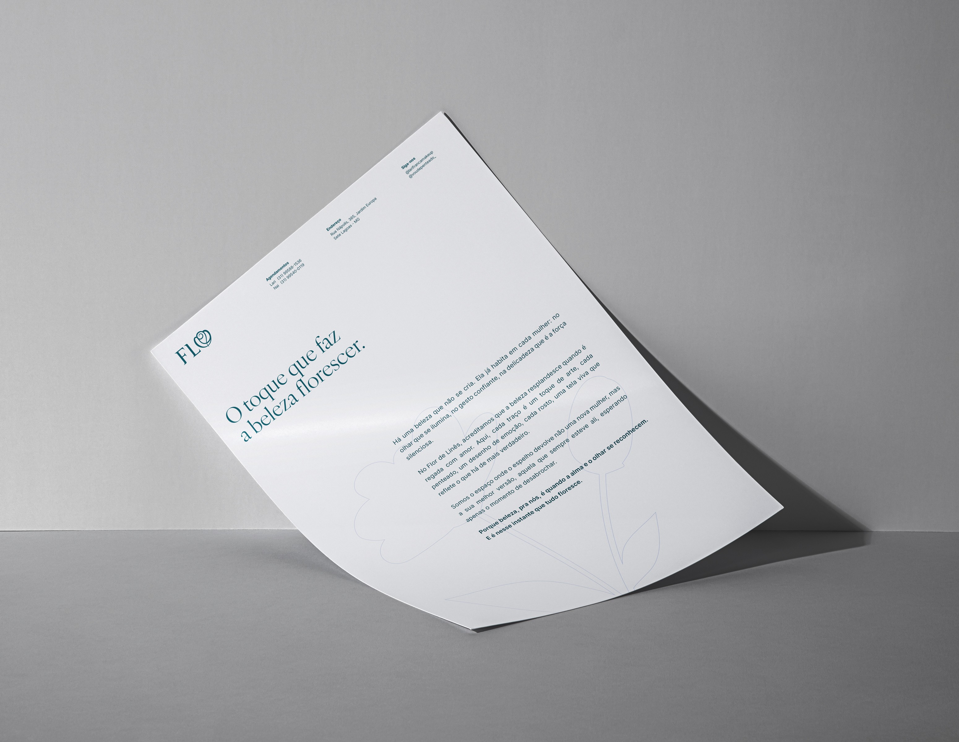 Invited by two sisters, founders and work partners, to develop the identity system for Flor de Linês, an atelier in Sete Lagoas, Minas Gerais, Brazil, that crafts refined makeups and hairstyles.